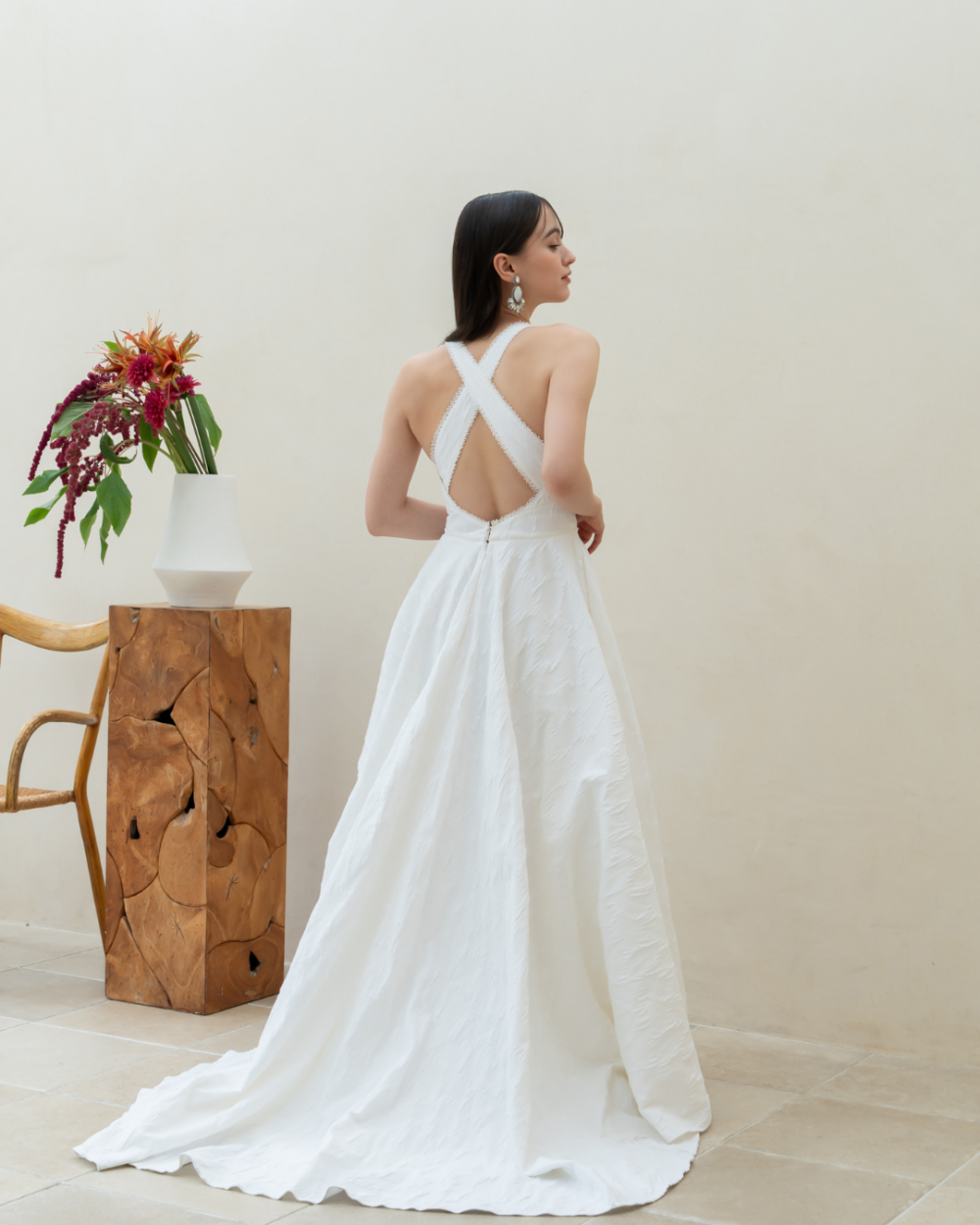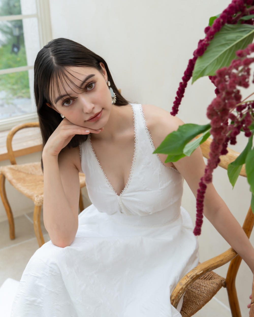 クリアなホワイトカラーと無垢なドレスの質感がpur-フランス語で純粋・無垢・純潔-の意味を纏うドレスです。